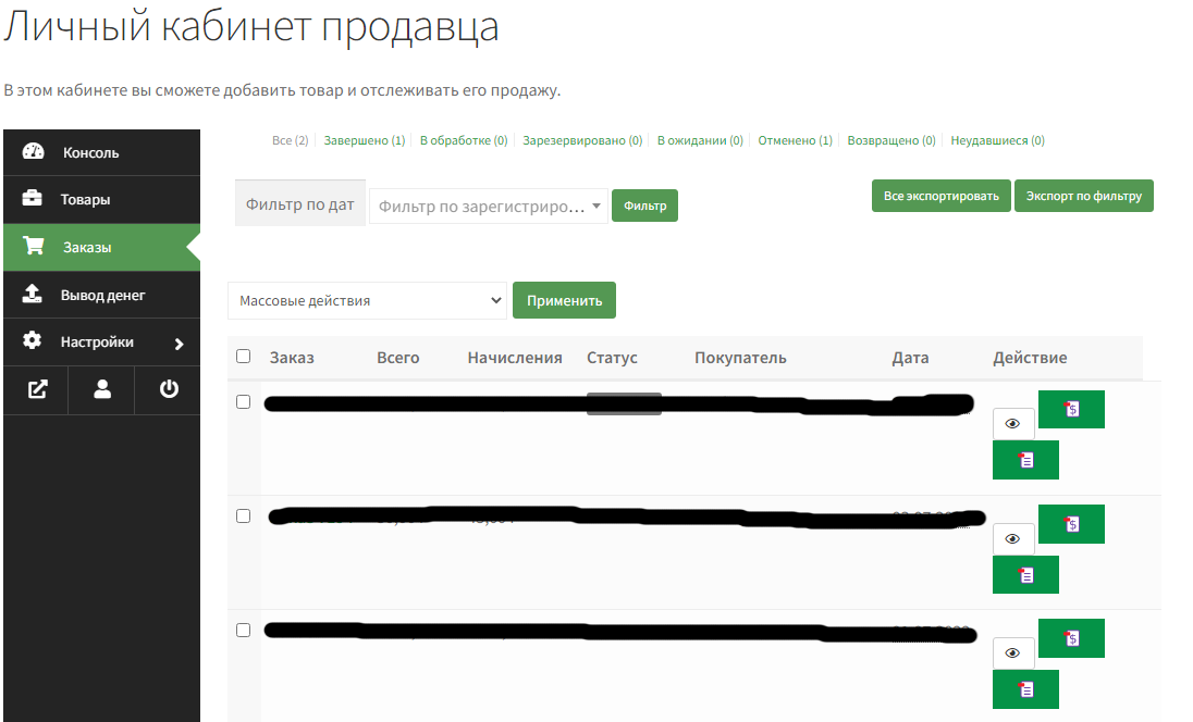 - Переводить в статусы вы также имеете право, на вкладке заказы . отменять заказ, переводить его в ожидание, или оплачено соответственно письмо о смене статуса придет покупателю.